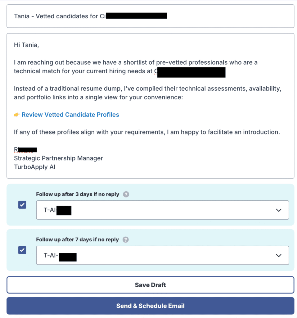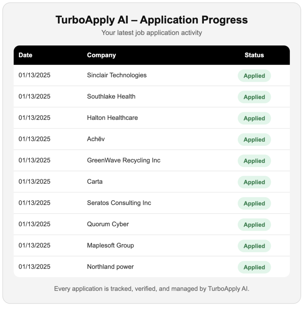 Stay informed without lifting a finger. You’ll receive clear, concise email reports detailing every job applied to, outreach performed by our Human Job expert + AI Job applier, and your overall progress. No dashboards to check, just actionable updates. The best part is that TurboApply AI is the only tool that not only applies but also follows up with recruiters via email and phone.